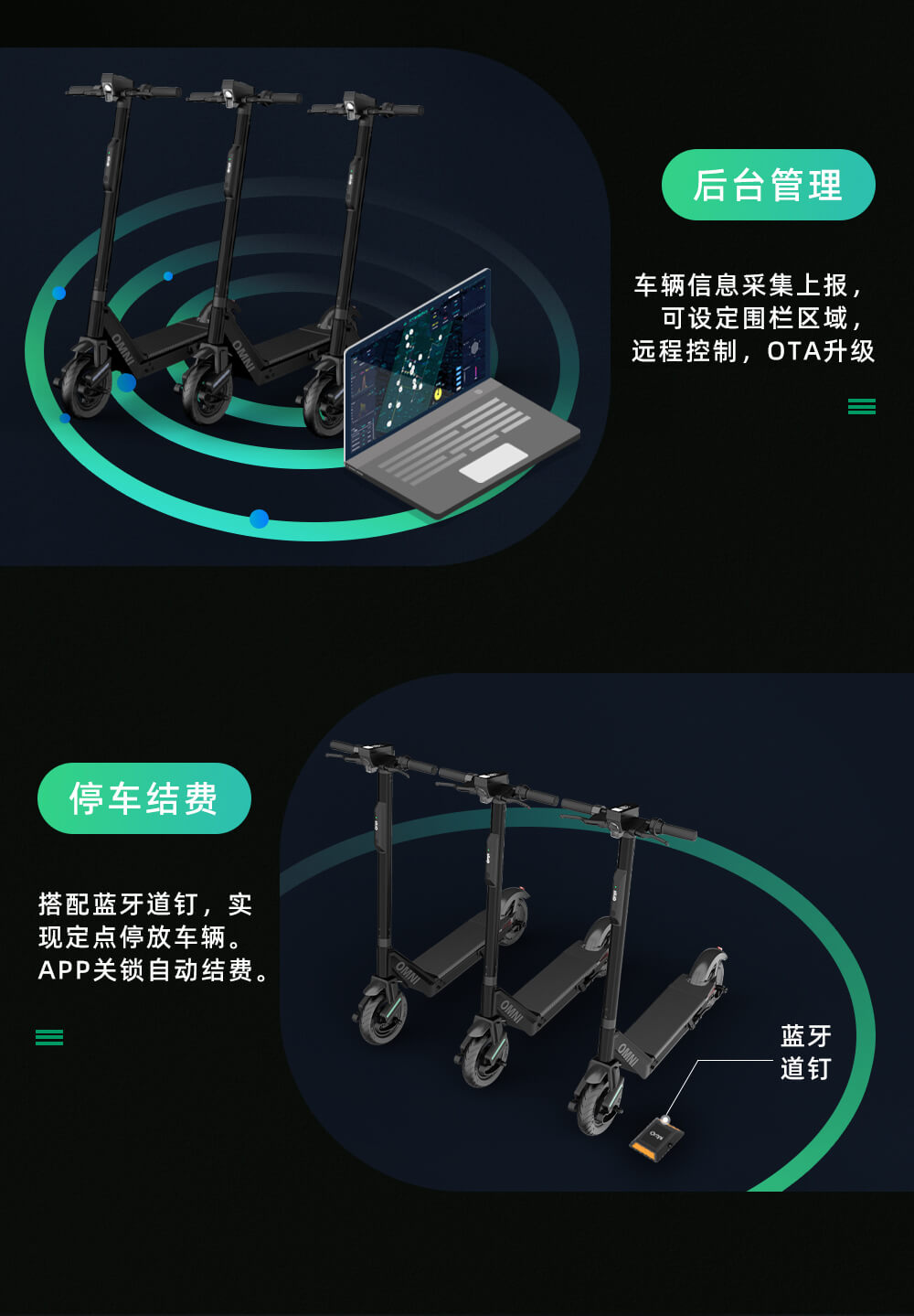 歐米智能共享滑板車(chē)半嵌入式IOT 雙頻GPS+慣導(dǎo)技術(shù) L1/L5 GNSS雙頻全球衛(wèi)星定位技術(shù),有效提高接收機(jī)位的定位精準(zhǔn)度,抑制路徑效應(yīng)的影響,并能很好的提高抗干擾能力,4G通訊技術(shù),開(kāi)鎖,上傳數(shù)據(jù)更快更精準(zhǔn),結(jié)費(fèi)時(shí)自動(dòng)鎖車(chē),環(huán)保塑膠材料,外表磨砂質(zhì)感,更耐磨,耐沖擊,耐腐蝕,耐高溫,延長(zhǎng)產(chǎn)品使用壽命,歐米智能共享滑板車(chē)解決方案在全球的校園,城市以及景區(qū)都擁有大量成功的案例