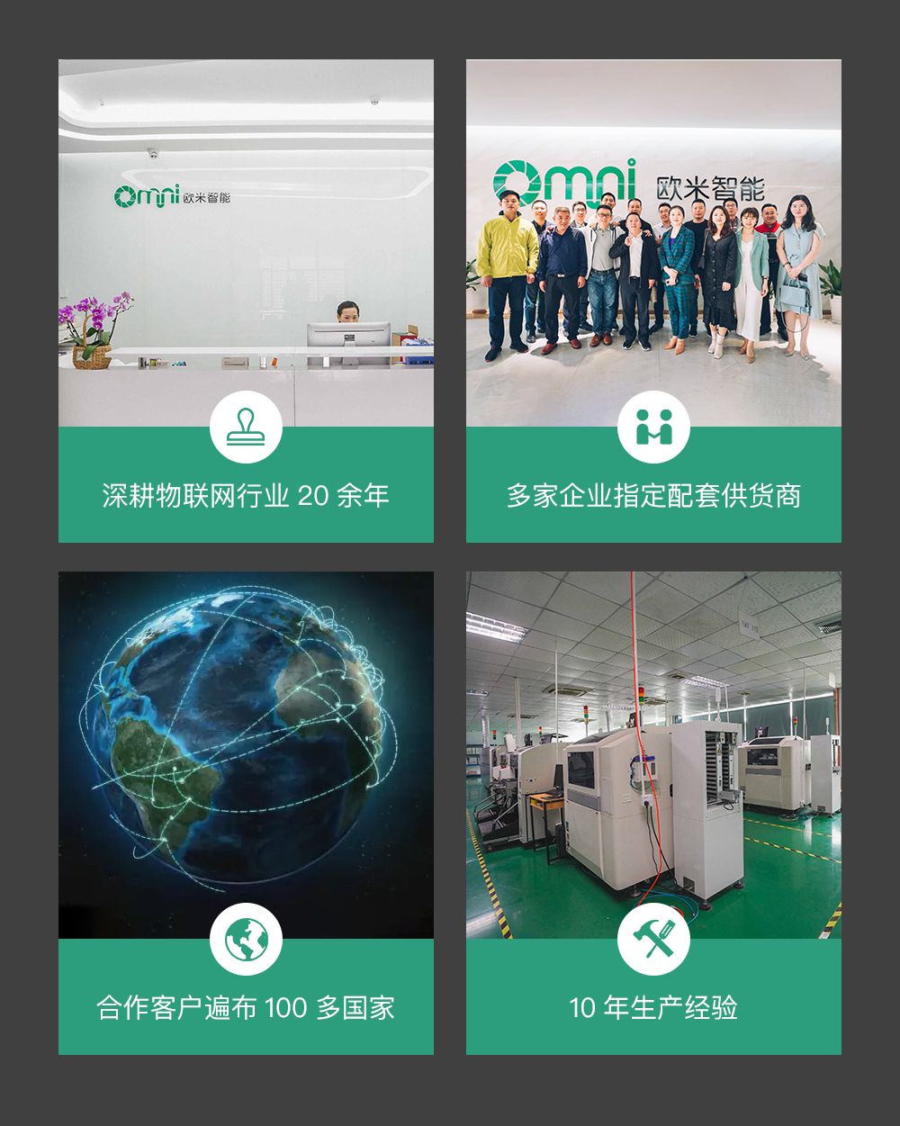 深圳歐米智能科技有限公司位于廣東省深圳市龍崗區(qū)南灣街道布瀾路21號(hào)聯(lián)創(chuàng)科技園3期31棟11樓,是一家專注于物聯(lián)網(wǎng)核心技術(shù)研發(fā)及應(yīng)用的國(guó)家級(jí)高新技術(shù)企業(yè)。辦公區(qū)與生產(chǎn)廠房面積約6000平方米,員工近200人,其中獨(dú)立研發(fā)團(tuán)隊(duì)約50余人,為產(chǎn)品的開發(fā)和設(shè)計(jì)提供了強(qiáng)有力的保障。在2018年度,公司被中國(guó)科學(xué)家論壇組委會(huì)授予“2018中國(guó)科技創(chuàng)新先進(jìn)單位”、被深圳市市場(chǎng)監(jiān)督管理局授予“2018年度廣東省守合同重信用企業(yè)”。